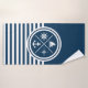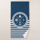 Nautical themed design with nautical symbols (anchor, sailing boat, sailing wheel, compass) decoration on white and navy blue striped background.