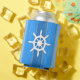Nautical themed design with sailing wheel decoration on striped blue and grey wooden background. Please note this is not made of wood, it is a wood graphic print.