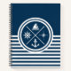 Nautical themed design with nautical symbols (anchor, sailing boat, sailing wheel, compass) decoration on white and navy blue striped background.