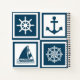 Nautical themed design with sailing wheel, sailing boat,compass and anchor decoration in white and blue striped squares