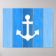 Nautical themed design with anchor decoration on striped blue and gray wooden background. Please note this is not made of wood, it is a wood graphic print.