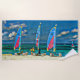 This beach towel features an image of three sail boats on the beach. It includes the colours blue, teal, aqua, pink, sand and yellow.