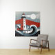 This tapestry presents a modernist vision of a lighthouse, where geometric shapes and bold colours converge to create a minimalist nautical scene. The composition is striking in its simplicity, with a stylized red and white lighthouse standing against the backdrop of a moonlit sea. Abstract waves, rendered in curves and lines, evoke a calm yet rhythmic ocean, suggesting the peaceful passage of time under the watchful gaze of the beacon. The play of light and shadow, along with the restrained colour palette, contributes to a sense of serenity and contemplation. This artwork is perfect for a contemporary setting that values clean lines, abstract beauty, and a modern take on classic maritime themes.