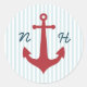 Nautical wedding stickers, coordinate with my Nautical wedding suite. Design is a red anchor on a blue and white striped background, with monogram letters. Perfect for sealing your invitations/save the dates/party favours.
