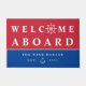 Nautical door mat for your boat in red and blue with welcome aboard written in white. The o in welcome is replaced with a ship's wheel. Personalize the boat welcome mat with the boat name.
