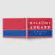 Nautical guestbook for your boat in red and blue with welcome aboard written in white. The o in welcome is replaced with a ship's wheel. Personalize the ship guestbook with the boat name.
