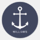 Modern Minimalist Nautical Round Sticker feature white anchor with personalized name in white modern sans serif font style on navy blue background.