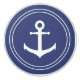 A white boat anchor is in the center of a dark blue circle. The background is a dark blue. Two white circles surround the anchor.