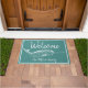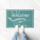 Cute nautical themed doormat featuring a white narwhal illustration over ocean green and your personalized family name.