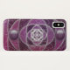 A stained-glass-like design of silver spirals and shades of plum, over a repeating backdrop of spiral fractals. The silver spirals converge into a silver rose design, with round gems for accents.