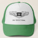 A hat for any weapons system officer, this trucker hat features custom name text and a black line drawing of navigator wings.