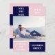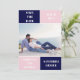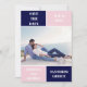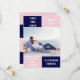 Navy blue and blush pink colour block wedding Save the Date card. The back includes a pattern with wide bands in blue and blush pink.