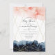 Baby shower invitation featuring navy blue and blush pink watercolor paint splashes and a gold geometric frame.