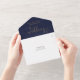 All in one wedding invitation featuring elegant gold hearts script typography and monogram initials on a navy blue background. The invitation includes a perforated RSVP card that can be individually addressed or left blank for you to handwrite your guest's address details. Designed by Thisisnotme©