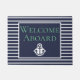 Perfectly chic, and classic navy and white customizable Welcome Aboard doormat for your boat of marina slip
