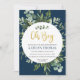 Gorgeous navy blue invitation with eucalyptus and greenery accents.