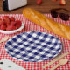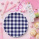 Dark blue, white, and light blue squares form a bold, buffalo plaid. The navy and white gingham pattern reminds me of classic decor.