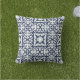 Add a summery Mediterranean twist to your poolside or patio decor with our chic navy and white patterned outdoor throw pillow. Design features an intricate Spanish tile pattern in navy and sky blue on a white background. Pattern repeats on reverse side.
