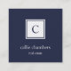 Chic and professional navy blue and white square business card design features a modern square element holding your single initial monogram, with your name and title or business name beneath in contemporary lowercase serif lettering. Personalize the reverse side with your contact details in matching navy. A contemporary choice for any occupation; sample shown for realtors or real estate agents.