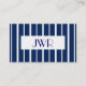 An elegant monogrammed business card with a simple navy and white pinstripe. There are note cards, stickers and postage stamps to match.