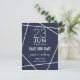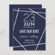A clean contemporary design in navy blue and white with minimalist appeal, this wedding Save the Date Card conveys your wedding plans with modern style. White geometric lines surround your text over a navy blue background. Bold numbers are used to accentuate the date of your wedding. Personalize the sample text in the design template with your wedding date, the bride and groom's names and the city location of your wedding. The reverse side of the card is shown in the same navy blue colour as the front. You can add additional text on the back if you wish (i.e. your wedding website or other desired comments), or simply leave the back as is.