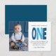 Modern, simple and elegant boy first birthday thank you card. Design featuring trendy script one , thank you message and a photo.