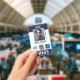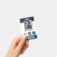 ID presse verticale avec détails bleu marine vous pouvez personnaliser avec trois logos et une photo. Appuyez sur le badge d'identification en blanc et bleu marine avec la place pour trois logos.