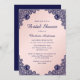 Elegant navy blue and blush bridal shower invitations featuring navy blue floral lace and an elegant script font on a blush background. Easily personalize online. Matching items available to complement these navy blue and blush vintage bridal shower invitations.