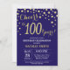 100th Birthday Invitation with Navy Blue and Gold Glitter Diamond Background. Gold Confetti. Adult Birthday. Male Men or Women Birthday. For further customization, please click the "Customize it" button and use our design tool to modify this template.