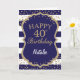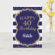 Navy Blue and Gold Glitter confetti 40th Birthday Card with personalized name. For further customization, please click the "Customize it" button and use our design tool to modify this template.