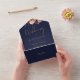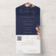 All-in-one wedding invitation featuring elegant gold typography on a navy blue background. The invitation includes a perforated RSVP card with your wedding website QR code and details. Designed by Thisisnotme©