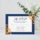 Elegant navy blue and orange flourish swirls wedding RSVP response card.
