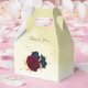 Beautiful wedding favour box featuring dark navy blue and red flowers and gold leaves.