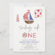 This sailing into one first birthday invitation features a sailing boat, lighthouse, helm and lifebuoy. Great for a nautical themed fist birthday invitation.