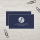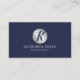 featuring navy blue script monogram in silver circle element with business information in silver professional font style on navy blue background.