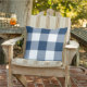 Pillow design features a casual gingham plaid / check pattern that is perfect for summertime! Note, you can customize the navy blue background colour to coordinate with your outdoor decor.