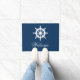 Elegant Navy blue and white nautical custom door mat. Make your own custom monogrammed indoor / outdoor doormat with custom background colour and text. Add your own welcome message, family name, surname, initial letter or funny quote. Cute gift idea for new home / housewarming, wedding venue, store, shop, company office, business etc. Stylish script typography white boat helm logo. Personalizable template with ship wheel icon. Create your own classy entry mat / rug for front door / entryway or hall. Customizable home decor / decorations for your beach house. Cute maritime gift idea for sailing / boating enthusiast, couple, sailor, boat captain or newly weds.