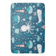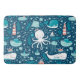 Add a custom nautical touch to your little kid's bathroom with this adorable ocean bath mat. Mat has a pattern of a whale, octopus, sailboat, steam boat, submarine, jellyfish, and lighthouse on a navy blue background. Rug may be personalized with the first name of your kid.