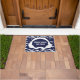 Fun doormat for the shark lovers out there. Dark navy blue doormat printed all over with white shark silhouettes, and an open shark jaw on top with customisable text to add your own names or message