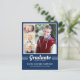 This sports-inspired graduation announcement postcard features a 4-photo layout and fun athletic design. On the front, choose four of your favourite photos for the template -- three smaller photos and one large vertical photo. Below the photos, the word "Graduate" is written in sporty script and framed by white stripes against a navy blue background. Add the graduate's name, graduation year, and school to the bottom. On the back of the graduation postcard, you can write a custom message to recipients and include grad party details.