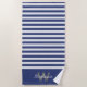 Personalize a navy blue and white striped beach towel with a monogram. Click the custom button to change initials and name.