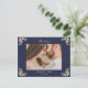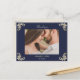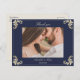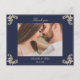 Elegant navy blue and gold baroque wedding thank you postcard with photo frame and monogram accents. A sophisticated way to express gratitude to your guests. Personalized with couple’s names and wedding date, this thank you card matches the full baroque navy blue invitation suite. Perfect for sending heartfelt appreciation after your wedding celebration.