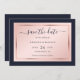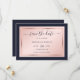 Elegant navy blue, blush and rose gold wedding save the date card featuring a modern script font. Easily personalize this card online. Matching items available to complement this minimalist, yet elegant wedding save the date card.