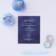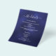 A modern, elegant wedding program/details/timeline. A navy blue coloured background. The blue colour is uneven. Personalize and add your names and wedding details. White coloured letters.