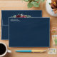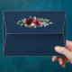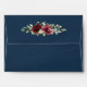 Design features a dark navy watercolor wash printed background (outside) with a printed gold coloured geometric or terrarium frame covered in elegant eucalyptus and greenery leaves/branches. Beautiful peony and rose floral elements in shades of burgundy, red, Marsala and more with hints of blush pink flowers appear over the greenery. The flap features a matching floral bouquet. Use a white or gold paint pen (found at most big box stores or craft outlets) to write out your guest names and addresses.