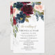 Design features beautiful watercolor floral elements (peony roses, several elegant English rose elements, etc) in shades of burgundy red, blush pink peach, navy blue and more over eucalyptus greenery, leaf elements, and more in shades of green, silver and antique gold.
