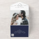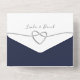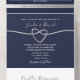 Simple, minimalist, elegant, modern, classic fancy calligraphy script navy blue all-in-one wedding invitation with faux silver rope heart and custom picture of the couple at the back.