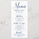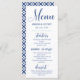 Minimalist wedding menu in white with navy blue calligraphy text and elegant fonts. Personalize with your names and wedding date. The back features a classic tiled pattern in matching colours.