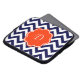 A customizable orange monogram frame is on a background of a bold navy blue and white chevron pattern.