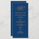 This elegant menu has an intertwined monogram in script font in shades of copper and copper text on a navy blue background.